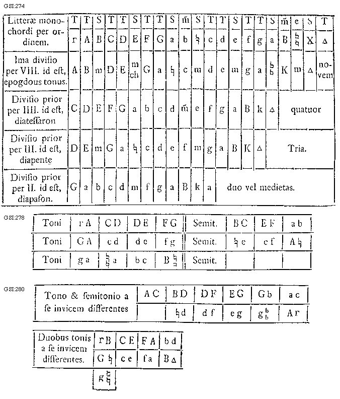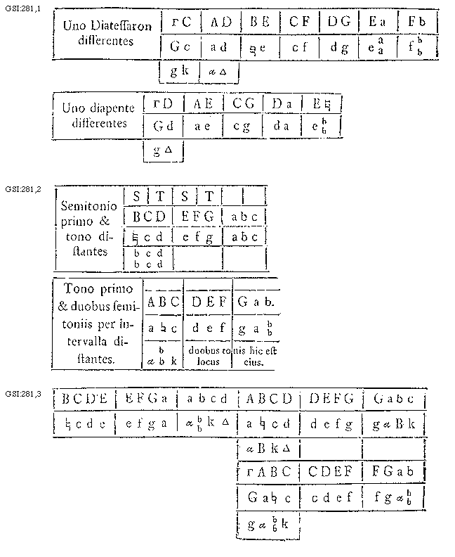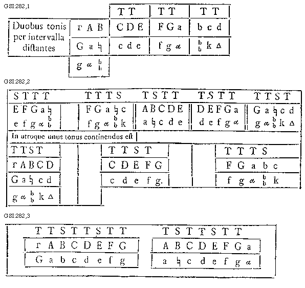 [GSI:280; text: Tono et semitonio a se invicem differentes, Duobus tonis a se invicem differentes. A, B, C, D, E, F, G, a, b, c, d, e, f, g, bb, [sqb][sqb], [Delta], [Gamma]]
