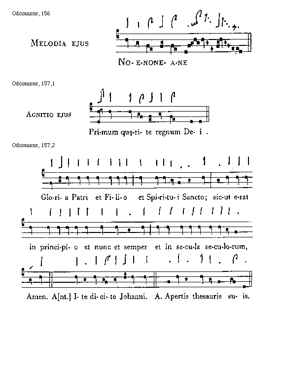 [Odorannus, 157,2; text: Gloria Patri et Filio et Spiritui Sancto; sicut erat in principio et nunc et semper et in secula seculorum, Amen. Antiphona Ite dicite Johanni. Apertis thesauris suis.]