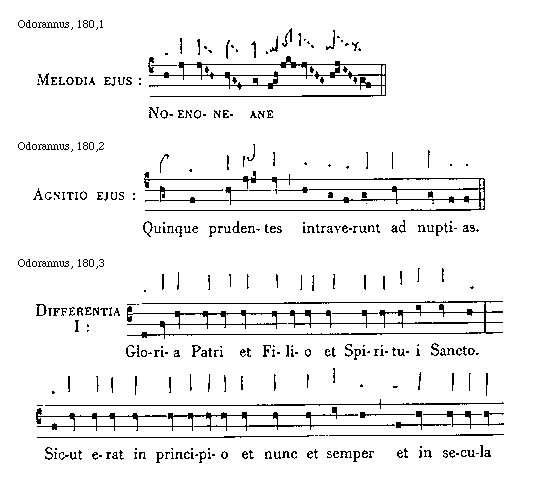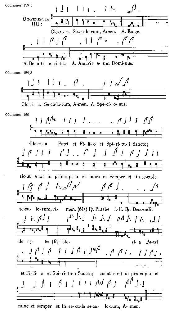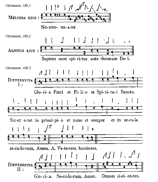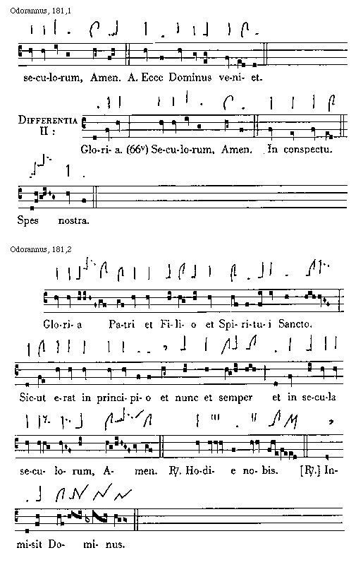 [Odorannus, 188,3; text: Differentia I: Gloria Patri et Filio et Spiritui Sancto. Sicut erat in principio et nunc et semper et in secula seculorum, Amen. Antiphona Veterem hominem. Differentia II: Gloria. Seculorum, Amen. Omnes sicientes.]