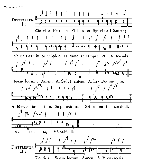[Odorannus, 161; text: Differentia I: Gloria Patri et Filio et Spiritui Sancto; sicut erat in principio et nunc et semper et in secula seculorum, Amen. Antiphona Salus autem. Lex Domini. Meditatio. Sapientiam. Scio cui credidi. Alleluia, Mirabilis. Differentia II: Gloria. Seculorum, Amen. Misereris.]