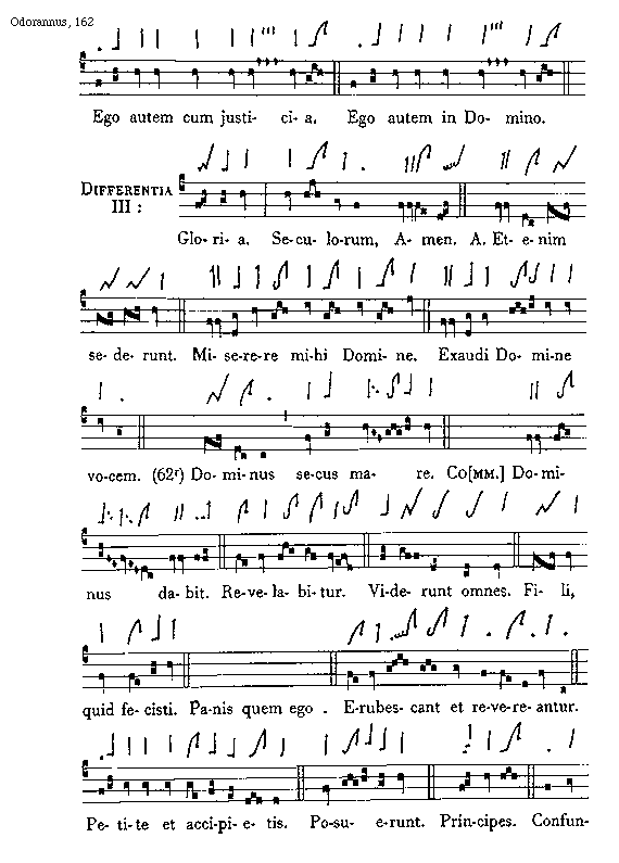 [162][Odorannus, 162; text: Ego autem cum justicia. Ego autem in Domino. Differentia III: Gloria. Seculorum, Amen. Antiphona Etenim sederunt. Miserere mihi Domine. Exaudi Domine vocem. (62r) Dominus secus mare. Communio Dominus dabit. Revelabitur. Viderunt omnes. Fili, quid fecisti. Panis quem ego. Erubescant et revereantur. Petite et accipietis. Posuerunt. Principes. Confundantur]