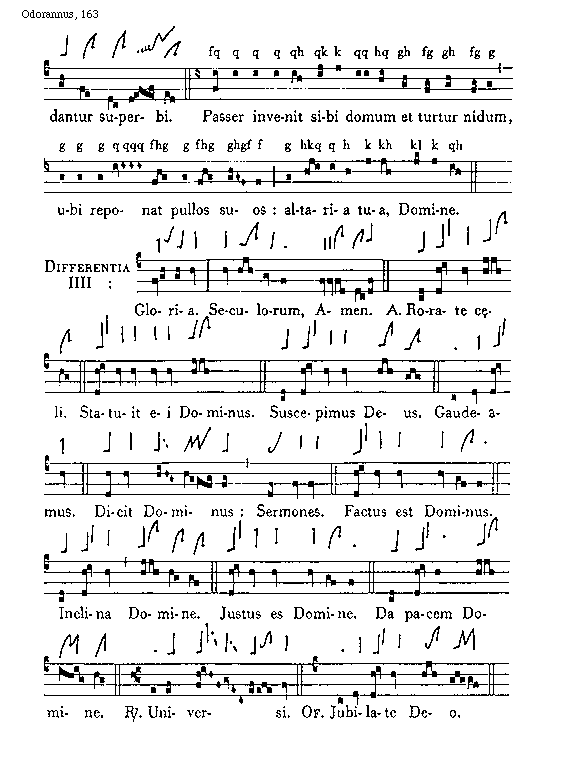 [163][Odorannus, 163; text: Confundantur superbi. Passer invenit sibi domum et turtur nidum, ubi reponat pullos suos: altaria tua, Domine. f, q, h, k, g, l, Differentia IIII: Gloria. Seculorum, Amen. Antiphona Rorate caeli. Statuit ei Dominus. Suscepimus Deus. Gaudeamus. Dicit Dominus: Sermones. Factus est Dominus. Inclina Domine. Justus es Domine. Da pacem Domine. Responsorium Universi. Offertorium Jubilate Deo.]