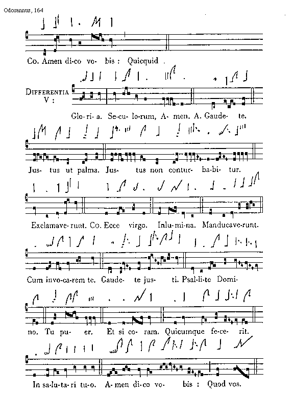 [164][Odorannus, 164; text: Communio Amen dico vobis: Quicquid. Differentia V: Gloria. Seculorum, Amen. Antiphona. Gaudete. Justus ut palma. Justus non conturbabitur. Exclamaverunt. Communio Ecce virgo. In lumina. Manducaverunt. Cum invocarem te. Gaudete justi. Psallite Domino. Tu puer. Et si coram. Quicumque fecerit. In salutari tuo. Amen dico vobis: Quod vos.]