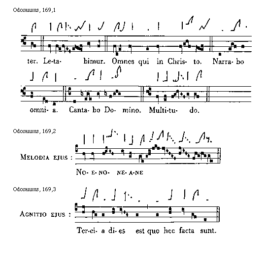[169][Odorannus, 169,1; text: noster. Letabimur. Omnes qui in Christo. Narrabo omnia. Cantabo Domino. Multitudo.]