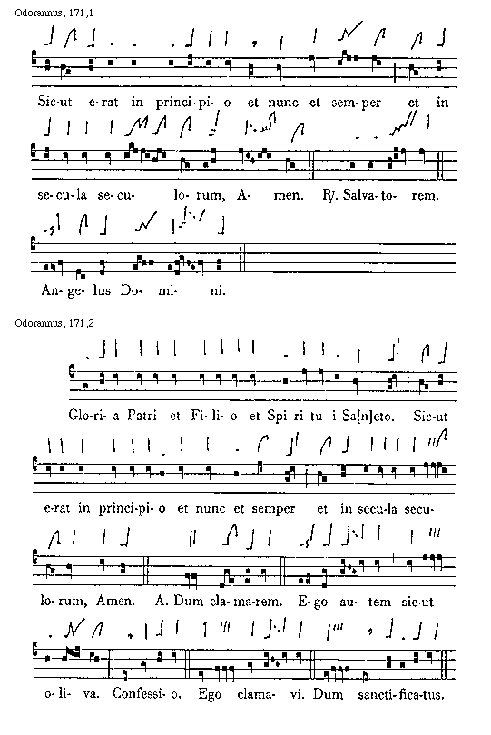 [Odorannus, 171,2; text: Gloria Patri et Filio et Spiritui Sa[n]cto. Sicut erat in principio et nunc et semper et in secula seculorum, Amen. Antiphona Dum clamarem. Ego autem sicut oliva. Confessio. Ego clamavi. Dum sanctificatus.]