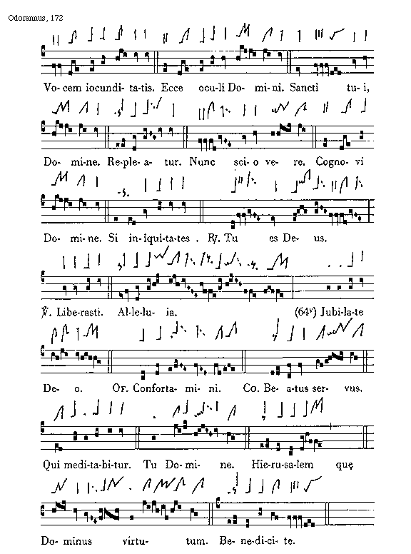 [172][Odorannus, 172; text: Vocem iocunditatis. Ecce oculi Domini. Sancti tui, Domine. Repleatur. Nunc scio vere. Cognovi Domine. Si iniquitates. Responsorium Tu es Deus. Versus Liberasti. Alleluia. (64v) Jubilate Deo. Offertorium Confortamini. Communio Beatus servus. Qui meditabitur. Tu Domine. Hierusalem quae Dominus virtutum. Benedicite.]
