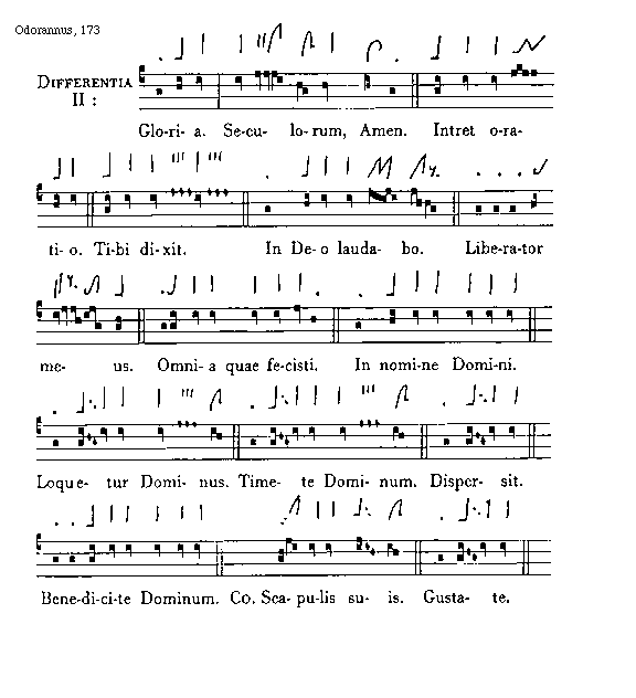 [173][Odorannus, 173; text: Differentia II: Gloria. Seculorum, Amen. Intret oratio. Tibi dixit. In Deo laudabo. Liberator meus Omnia quae fecisti. In nomine Domini. Loquetur Dominus. Timete Dominum. Dispersit. Benedicite Dominum. Communio Scapulis suis. Gustate.]