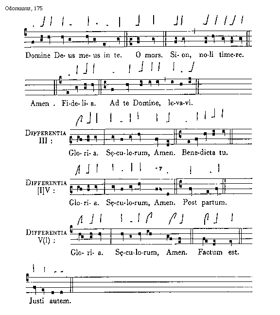 [175][Odorannus, 175; text: Domine Deus meus in te. O mors. Sion, noli timere. Amen. Fidelia. Ad te Domine, levavi. Differentia III: Gloria. Saeculorum, Amen. Benedicta tu. Differentia [I]V: Post partum. Differentia V(I): Factum est. Justi autem.]