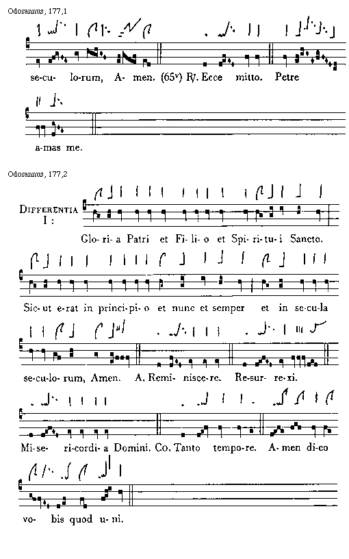 [Odorannus, 177,2; text: Differentia I: Gloria Patri et Filio et Spiritui Sancto. Sicut erat in principio et nunc et semper et in secula seculorum, Amen. Antiphona. Reminiscere. Resurrexi. Misericordia Domini. Communio Tanto tempore. Amen dico vobis quod uni.]