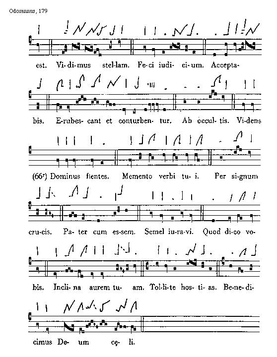 [179][Odorannus, 179; text: est. Vidimus stellam. Feci iudicium. Acceptabis. Erubescant et conturbentur. Ab occultis. Videns (66r) Dominus flentes. Memento verbi tui. Per signum crucis. Pater cum essem. Semel iuravi. Quod dico vobis. Inclina aurem tuam. Tollite hostias. Benedicimus Deum caeli.]