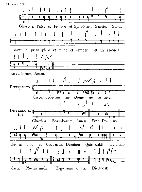 [Odorannus, 182; text: Gloria Patri et Filio et Spiritui Sancto. Sicut erat in principio et nunc et semper et in secula seculorum, Amen. Differentia I: Circumdederunt me. Domine in tua. Differentia II: Gloria. Seculorum, Amen. Ecce Deus. Deus in loco. Communio Justus Dominus. Quis dabit. Tu mandasti. Notas mihi. Ego sum vitis. Dilexisti.]