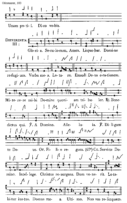 [183][Odorannus, 183; text: Unam petii. Dico vobis. Differentia III: Gloria. Seculorum, Amen. Loquebar. Domine refugium. Verba mea. Letare. Exaudi Deus orationem. Miserere mihi Domine quoniam tribulor. Responsorium Benedictus qui. Versus A Domino. Alleluia. Versus Diligam te Deus. Officium Filie regum. (67r) Communio Servite Domino. Intellege. Christus resurgens. Dum venerit. Letabitur iustus. Domus mea. Ultimo. Non vos relinquam.]