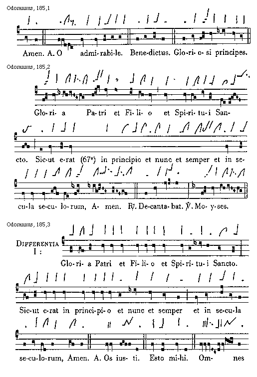 [Odorannus, 185,3; text: Differentia I: Gloria Patri et Filio et Spiritui Sancto. Sicut erat in principio et nunc et semper et in secula seculorum, Amen. Antiphona Os iusti. Esto mihi. Omnes]