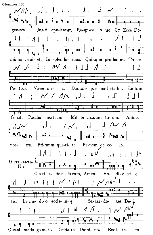 [186][Odorannus, 186; text: gentes. Justi epulentur. Respice in me. Communio Ecce Dominus veniet. In splendoribus. Quinque prudentes. Tu es Petrus. Voce mea. Domine quis habitabit. Lutum fecit. Pascha nostrum. Mitte manum tuam. Anima nostra. Primum quaerite. Panem de celo. Differentia II: Gloria. Seculorum Amen. Hodie scietis. In medio ecclesiae. Sacerdotes Dei. Quasi modo geniti. Cantate Domino. Exultate]