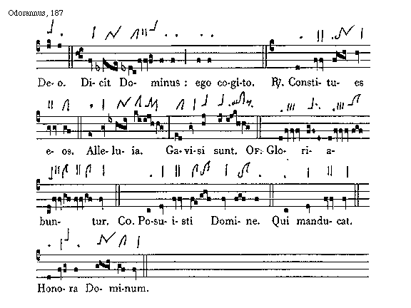 [187][Odorannus, 187; text: Deo. Dicit Dominus: ego cogito. Responsorium constitues eos. Alleluia. Gavisi sunt. Offertorium Gloriabuntur. Communio Posuisti Domine. Qui manducat. Honora Dominum.]