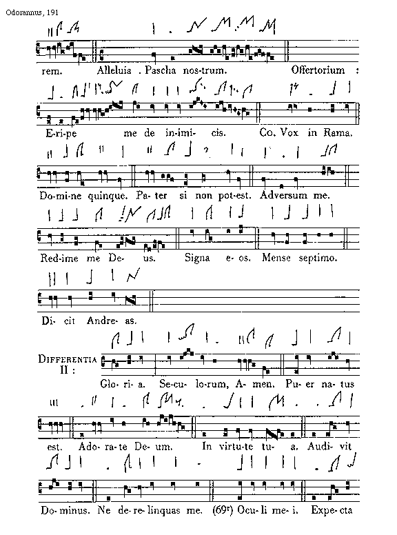 [191][Odorannus, 191; text: clamarem. Alleluia. Pascha nostrum. Offertorium: Eripe me de inimicis. Communio Vox in Rama. Domine quinque. Pater si non potest. Adversum me. Redime me Deus. Signa eos. Mense septimo. Dicit Andreas. Differentia II: Gloria. Seculorum, Amen. Puer natus est. Adorate Deum. In virtute tua. Audivit Dominus. Ne derelinquas me. (69r) Oculi mei. Expecta]