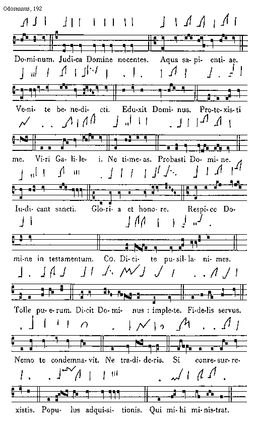 [192][Odorannus, 192; text: Dominum. Judica Domine nocentes. Aqua sapientiae. Venite benedicti. Eduxit dominus. Protexisti me. Viri Galilei. Ne timeas. Probasti Domine. Iudicant sancti. Gloria et honore. Respice Domine in testamentum. Communio Dicite pusillanimes. Tolle puerum. Dicit Dominus: implete. Fidelis servus. Nemo te condemnavit. Ne tradideris. Si conresurrexistis. Populus adquisitionis. Qui mihi ministrat.]