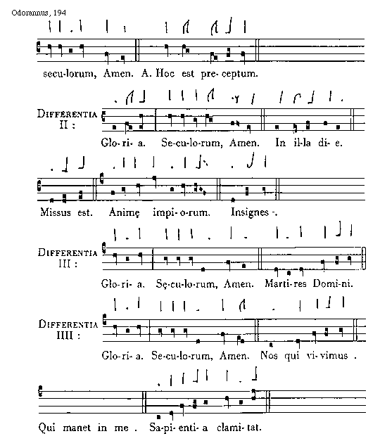 [194][Odorannus, 194; text: seculorum, Amen. Antiphona Hoc est preceptum. Differentia II: Gloria. Seculorum, Amen. In illa die. Missus est. Animae impiorum. Insignes. Differentia III: Martires Domini. Differentia IIII: Nos qui vivimus. Qui manet in me. Sapientia clamitat.]
