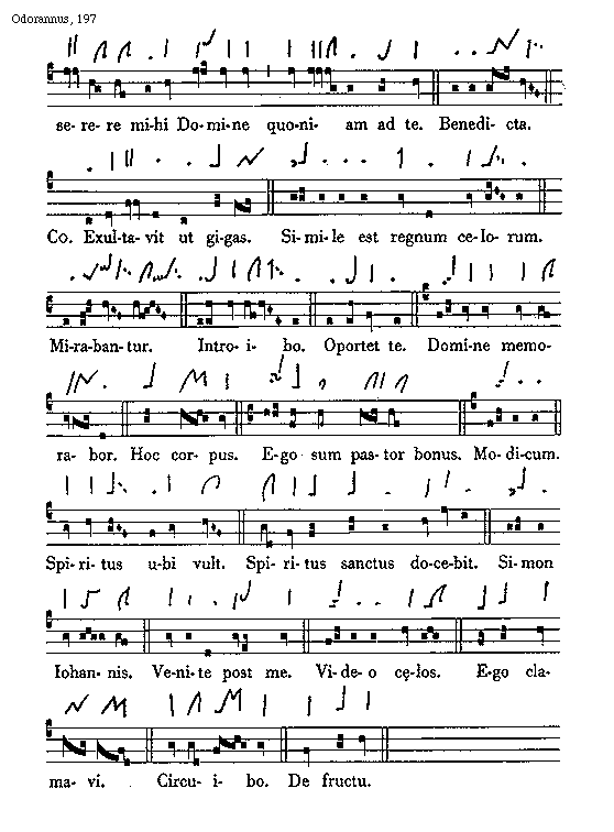 [197][Odorannus, 197; text: Miserere mihi Domine quoniam ad te. Benedicta. Communio Exultavit ut gigas. Simile est regnum celorum. Mirabantur. Introibo. Oportet te. Domine memorabor. Hoc corpus. Ego sum pastor bonus. Modicum. Spiritus ubi vult. Spiritus sanctus docebit. Simon Iohannis. Venite post me. Video caelos. Ego clamavi. Circuibo. De fructu.]