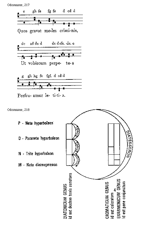 [Odorannus, 218; text: P, Nete hyperboleon, O, Paranete hyperboleon, N, Trite hyperboleon, M, Nete diezeugmenon, DIATESSERON, TONUS, SEMITONIUM, DIATONICUM GENUS id est duobus tonis constans, CROMATICUM GENUS id est coloratum, ENARMONICUM GENUS id est pene conjunctum]