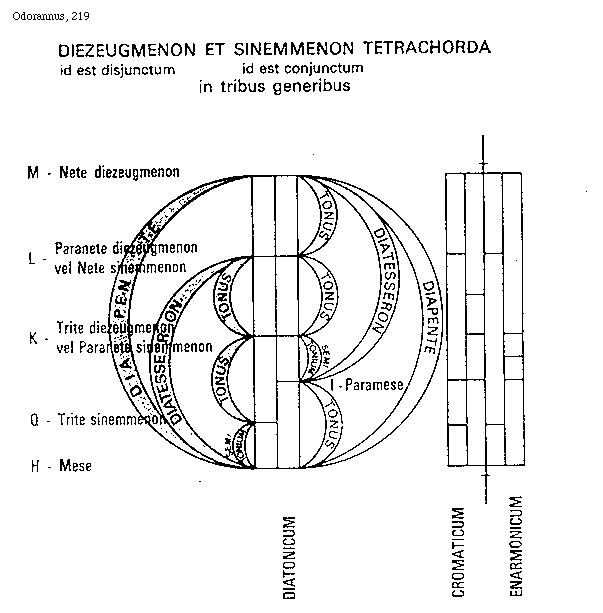 [219][Odorannus, 219; text: DIEZEUGMENON ET SINEMMENON TETRACHORDA, id est disjunctum, id est conjunctum in tribus generibus, M, Nete diezeugmenon, L, Paranete diezeugmenon vel Nete sinemmenon, K, Trite diezeugmenon vel Paranete sinemmenon, Q, Trite sinemmenon, H, Mese, I, Paramese, DIATONICUM, CROMATICUM, ENARHMONICUM, TONUS, SEMITONIUM, DIATESSERON, DIAPENTE]