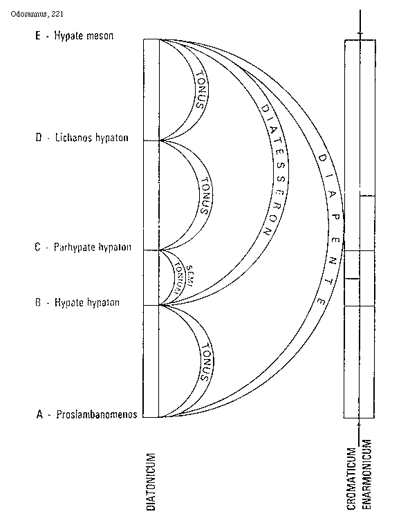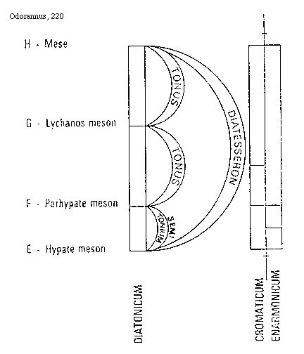 [210]haec sit trite hyperboleon enarmonica. Illud quoque sciendum quod omnis nete et paramese et mese et hypate et proslambanomenae in tribus generibus sunt immobiles, et initia et fines tetrachordorum operentur; et quod diatonicon genus constet duobus tonis et semitonio, et cromaticum genus tribus semitoniis incompositis et majore et minore compositis; enarmonicumque duobus tonis incompositis et diesi et diesi.
