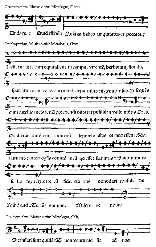 [Ornithoparchus, f.Iivv; text: Hesterna luce cum equitassem in campum, virentem, herbosum, floridum, spaciaturus in eo: occurrit mihi lepusculus cum genitore suo. Insequens eum catellis meis sex Apprehendi dumtaxat pusillum in valle montis Oreb. Deliberans autem cui amicorum leporias istas carnes essem condonaturus: interrogans comitem meum quod esset suasurus? Sano mihi consilio dixit. Hortor cum fiducia eas donodari consuli de Brunschuick. Tu autem domine. Miserere nobis]