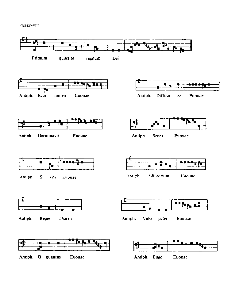 [CSM29:VIII; text: Primum quaerite regnum Dei, Antiphona. Ecce nomen, Euouae, Diffusa est, Germinavit, Senex, Si vos, Adiutorium, Reges Tharsis, Volo pater, O quantus, Euge]