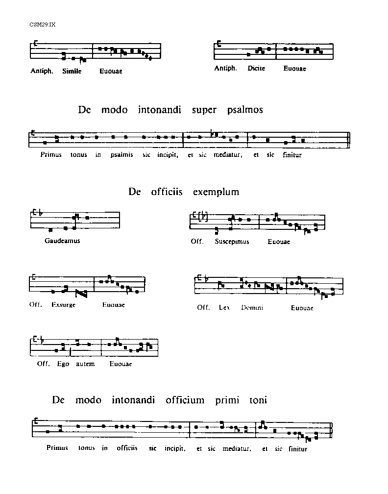 [IX][CSM29:IX; text: Antiphona. Simile, Euouae, Dicite, De modo intonandi super psalmos, Primus tonus in psalmis sic incipit, et sic mediatur, et sic finitur, De officiis exemplum, Gaudeamus, Officium. Suscepimus, Exsurge, Lex Domini, Ego autem, De modo intonandi officium primi toni, Primus tonus in officiis sic incipit, et sic mediatur, et sic finitur]