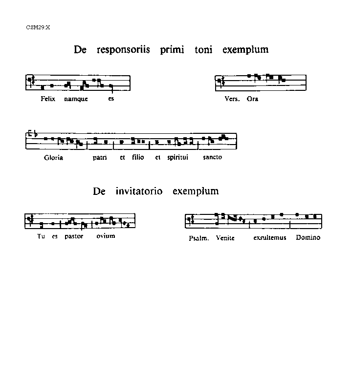 [X][CSM29:X; text: De responsoriis primi toni exemplum, Felix namque es, Versus. Ora, Gloria patri et filio et spiritui sancto, De invitatorio exemplum, Tu es pastor ovium, Psalmus. Venite exsultemus Domino]