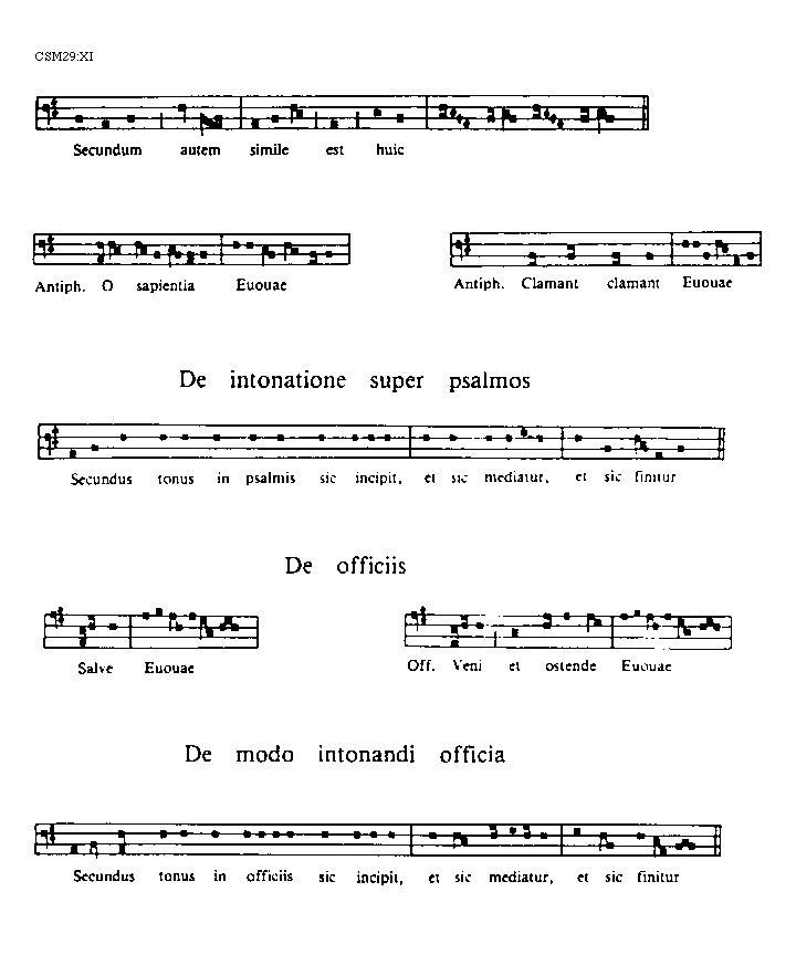 [CSM29:XI; text: Secundum autem simile est huic, Antiphona. O sapientia, Euouae, Clamant clamant, De intonatione super psalmos, Secundus tonus in psalmis sic incipit, et sic mediatur, et sic finitur, De officiis, Salve, Officium. Veni et ostende, De modo intonandi officia, Secundus tonus in officiis sic incipit, et sic mediatur, et sic finitur]