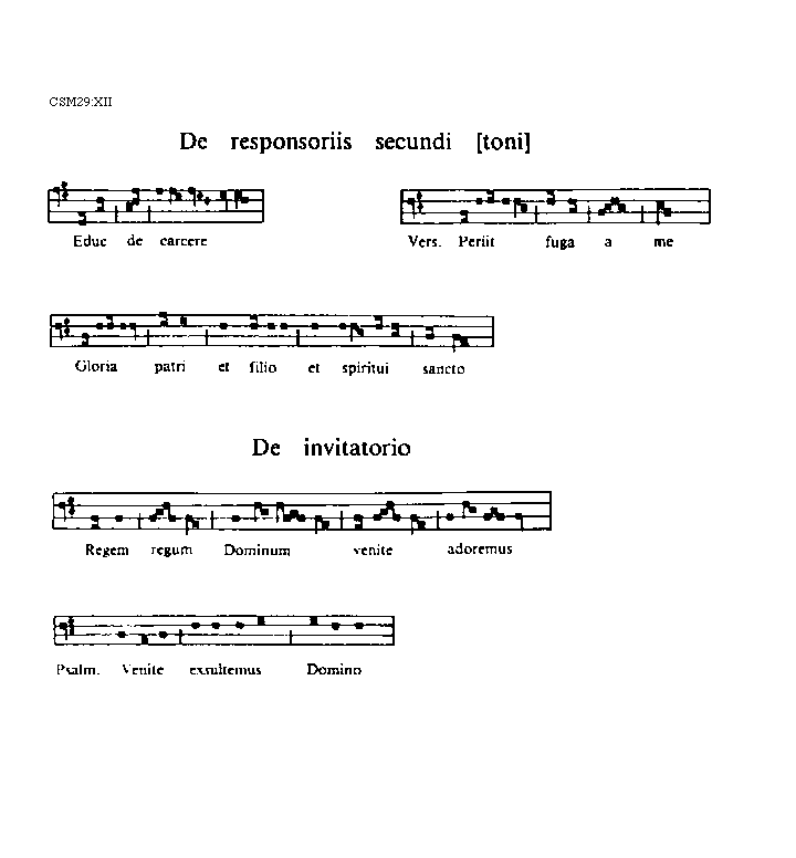 [XII][CSM29:XII; text: De responsoriis secundi [toni], Educ de carcere, Versus. Periit fuga a me, Gloria patri et filio et spiritui sancto, De invitatorio, Regem regum Dominum venite adoremus, Psalmus. Venite exsultemus Domino]