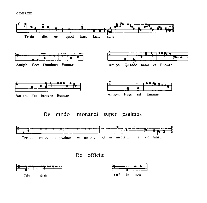 [CSM29:XIII; text: Tertia dies est quod haec facta sunt, Antiphona. Ecce Dominus, Euouae, Quando natus es, Fac benigne, Haec est, De modo intonandi super psalmos, Tertius tonus in psalmis sic incipit, et sic mediatur, et sic finitur, De officiis, Tibi dixit, Officium. In Deo]
