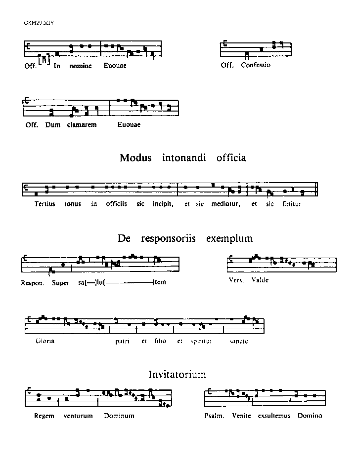 [XIV][CSM29:XIV; text: Offertorio. In nomine, Euouae, Confessio, Dum clamarem, Modus intonandi officia, Tertius tonus in officiis sic incipit, et sic mediatur, et sic finitur, De responsoriis exemplum, Responsorium. Super salutem, Versus. Valde, Gloria patri et filio et spiritui sancto, Invitatorium, Regem venturum Dominum, Psalmus. Venite exsultemus Domino]