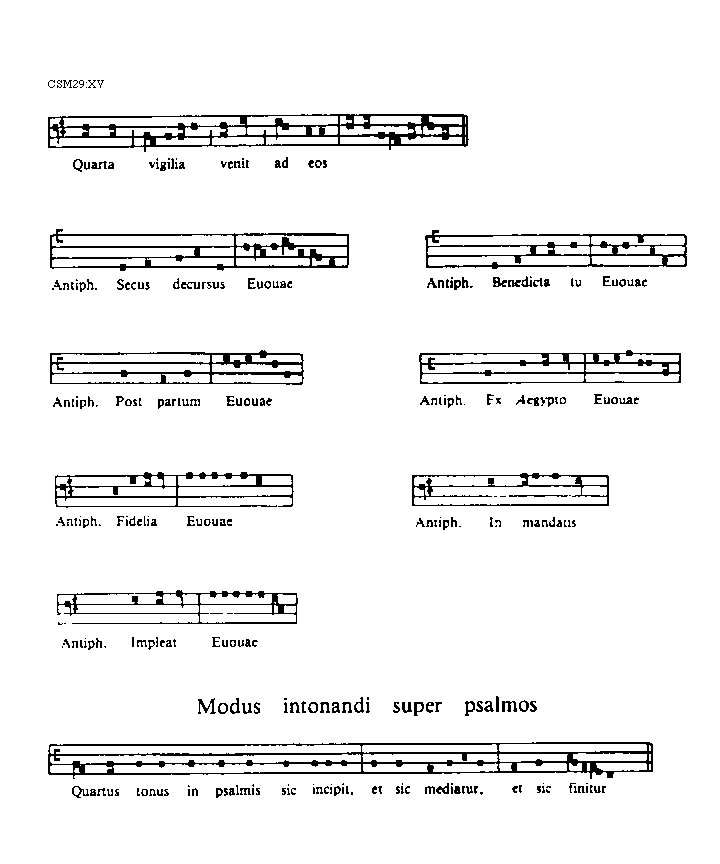 [CSM29:XV; text: Quarta vigilia venit ad eos, Antiphona. Secus decursus, Euouae, Benedicta tu, Post partum, Ex Aegypto, Fidelia, In mandatis, Impleat, Modus intonandi super psalmos, Quartus tonus in psalmis sic incipit, et sic mediatur, et sic finitur]