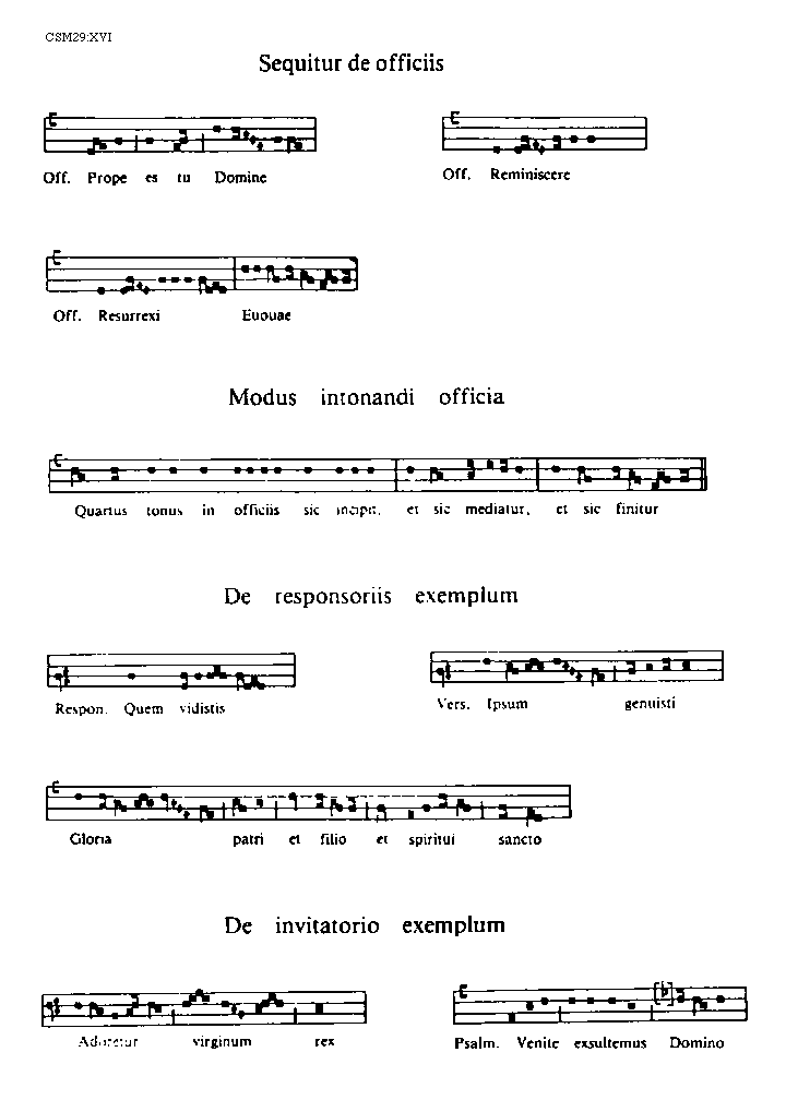 [XVI][CSM29:XVI; text: Sequitur de officiis, Officium. Prope es tu Domine, Remiscere, Resurrexi, Modus intonandi officia, Quartus tonus in officiis sic incipit, et sic mediatur, et sic finitur, De responsoriis exemplum, Responsorium. Quem vidistis, Ipsum genuisti, Gloria patri et filio et spiritui sancto, De invitatorio exemplum, Adoretur virginum rex, Psalmus. Venite exsultemus Domino]