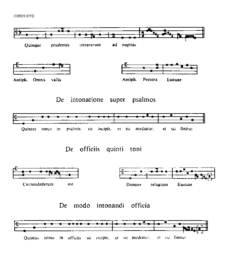 [CSM29:XVII; text: Quinque prudentes intraverunt ad nuptias, Antiphona. Omnis vallis, Pectora, Euouae, De intonatione super psalmos, Quintus tonus in psalmis sic incipit, et sic mediatur, et sic finitur, De officiis quinti toni, Circumdederunt me, Domine refugium, De modo intonandi officia, Quintus tonus in officiis sic incipit, et sic mediatur, et sic finitur]