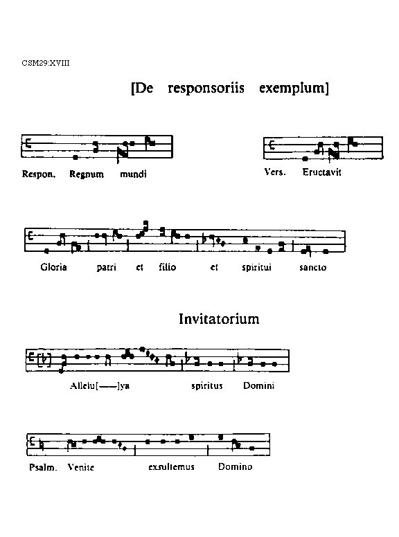[XVIII][CSM29:XVIII; text: [De responsoriis exemplum] Responsorium. Regnum mundi, Versus. Eructavit, Gloria patri et filio et spiritui sancto, Invitatorium, Alleluya spiritus Domini, Psalmus. Venite exsultemus Domino]