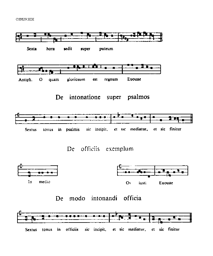 [CSM29:XIX; text: Sexta hora sedit super puteum, Antiphona. O quam gloriosum est regnum, Euouae, De intonatione super psalmos, Sextus tonus in psalmis sic incipit, et sic mediatur, et sic finitur, De officiis exemplum, In medio, Os iusti, De modo intonandi officia, Sextus tonus in officiis sic incipit, et sic mediatur, et sic finitur]