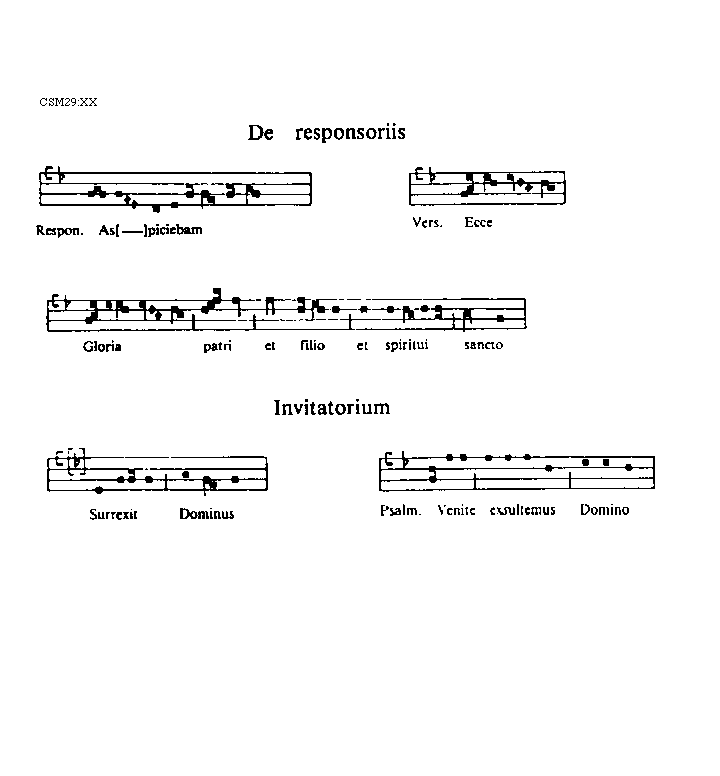 [XX][CSM29:XX; text: De responsoriis, Responsorium. Aspiciebam, Versus. Ecce, Gloria patri et filio et spiritui sancto, Invitatorium, Surrexit Dominus, Psalmus. Venite exsultemus Domino]