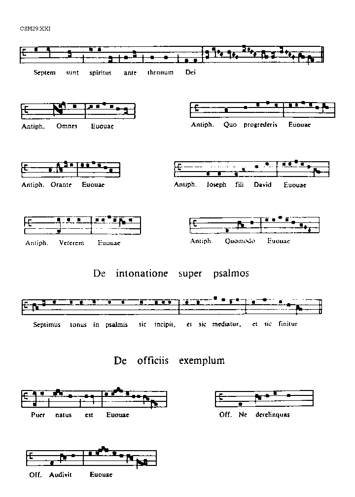 [CSM29:XXI; text: Septem sunt spiritus ante thronum Dei, Antiphona. Omnes, Euouae, Quo progrederis, Orante, Ioseph fili David, Veterem, Quomodo, De intonatione super psalmos, Septimus tonus in psalmis sic incipit, et sic mediatur, et sic finitur, De officiis exemplum, Puer natus est, Officium. Ne derelinquas, Audivit]