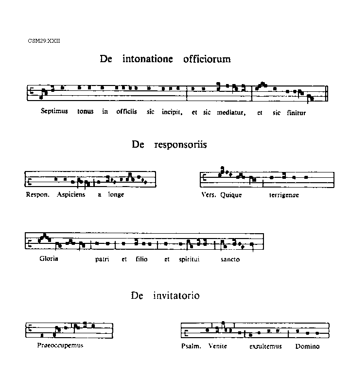 [XXII][CSM29:XXII; text: De intonatione officiorum, Septimus tonus in officiis sic incipit, et sic mediatur, et sic finitur, De responsoriis, Responsorium. Aspiciens a longe, Versus. Quique terrigenae, Gloria patri et filio et spiritui sancto, De invitatorio, Praeoccupemus, Psalmus. Venite exsultemus Domino]