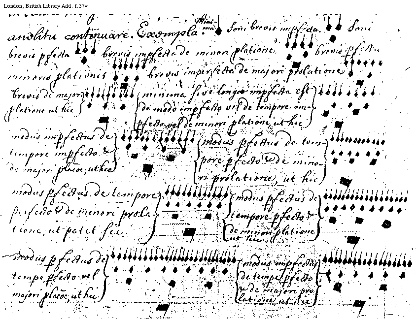 [London, British Library, Add. f.37v; text: Minima, Semibrevis imperfecta. Semibrevis perfecta, brevis imperfecta de minori prolatione, brevis perfecta minoris prolationis, brevis imperfecta de majori prolatione, brevis de majori prolatione ut hic, minima sive longae imperfecta est de modo imperfecto vel de tempore imperfecto vel de minori prolatione, ut hic, modus imperfectus de tempore imperfecto et de majori prolatione, ut hic modus perfectus de tempore perfecto et de minori prolatione, ut hic, ut patet sic, modus perfectus de tempore perfecto et de minori prolatione ut hic, modus perfectus de tempore perfecto vel majori prolatione, ut hic, modus imperfectus de tempore perfecto et de majori prolatione, ut hic]