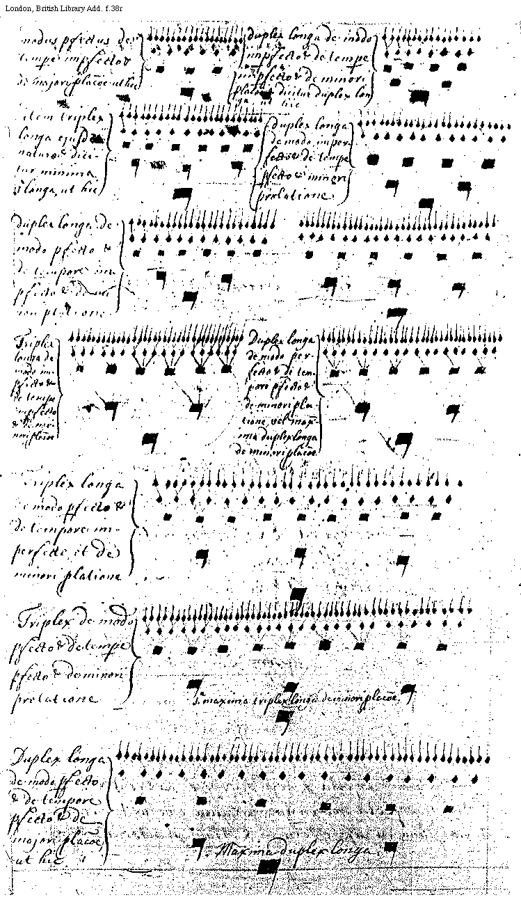 [f.38r][London, British Library, Add. f.38r; text: modus perfectus de tempore imperfecto et de majori prolatione ut hic, duplex longa de modo imperfecto et de tempore imperfecto et de minori prolatione dicitur duplex longa, ut hic, item triplex longa ejusdem naturae et dicitur minima et longa, ut hic, duplex longa de modo imperfecto et de tempore perfecto et minori prolatione, duplex longa de modo perfecto et de tempore imperfecto et de minor prolationi, Triplex longa de modo imperfecto et de tempore imperfecto et de minori prolatione, Duplex longa de modo perfecto et de tempore perfecto et de minori prolatione vel maxima duplex longa de minori prolatione, Triplex longa de modo perfecto et de tempore imperfecto et de minori prolatione, Triplex de modo perfecto et de tempore perfecto et de minori prolatione, prima maxima triplex longa de minori prolatione. Duplex longa de modo perfecto et de tempore perfecto et de majori prolatione, ut hic, Maxima duplex longa.]