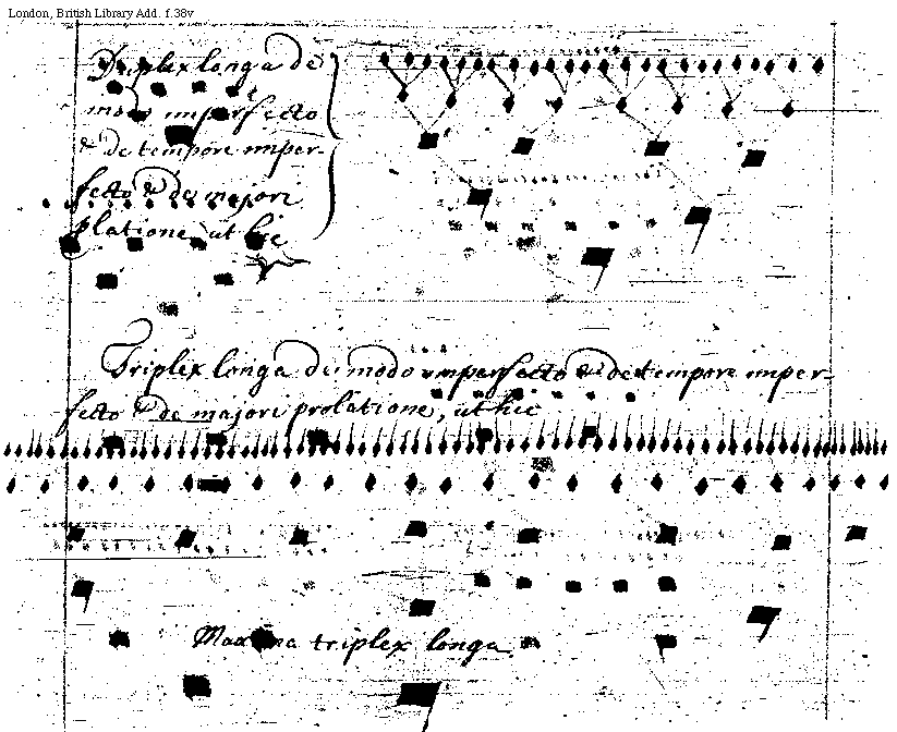 [f.38v][London, British Library, Add. f.38v; text: Duplex longa de modo imperfecto et de tempore inperfecto et de majori prolatione, ut hic, Triplex longa de modo inperfecto et de tempore inperfecto et de majori prolatione, ut hic, Maxima triplex longa]