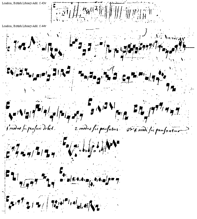 [f.44v][London, British Library, Add. f.44v; text: Primus modus sic pausari debet, Secundus modus sic pausatur, Tertii et Quarti modi sic pausantur]
