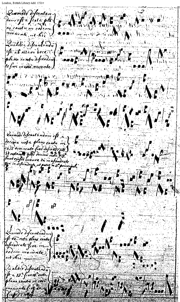 [f.51v][London, British Library, Add. f.51v; text: Quomodo discantandum est a sexta plano cantu in eodem manente, ut hic, Qualiter discantandum est ab octavo voce plano cantu descendente sive in eodem manente, Quomodo discantandum est a decima nota plano cantu in eodem manente sive descendente. Et notandum quod decima nota et tertia sunt ejusdem natura tam in ascendente quam in descendente, ut patet in tertio principali. Quomodo discantandum est duodecima nota plano cantu descendente sive in eodem manente, ut hic, Qualiter discantandum est a tertiadecima sive quintadecima nota plano cantu in eodem manente sive descendente]