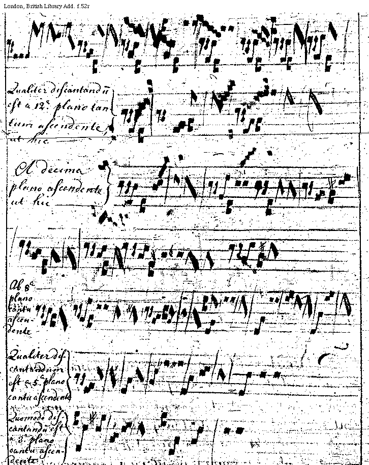[f.52v][London, British Library, Add. f.52v; text: Qualiter discantandum est a tertia plano cantu ascendente et descendente, ut hic, A sexta plano cantu descendente, ut hic patet, A quinta plano cantu descendente, Item notandum quod in Curia Romana et Ecclesia Francigena non ascendunt per sextas cum plano cantu, nisi fuerit raro et hoc ut in sequente exemplo patet, Qualiter discantandum est a decima plano cantu ascendente et descendente]