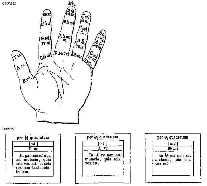 Sciendum est etiam quod pro pueris informandis, monocordum in sinistra manu potest assignari hoc modo : Incipiatur [Gamma] a summitate pollicis, deinde assignetur A gravis in junctura proxima illi; in tertia, [sqb] gravis. Sic consequenter transeundo per infimas juncturas, quatuor digitorum ascendendo per auricularem et transeundo per summitates digitorum et descendendo per indicem ad mediam junctam ipsius, transeundo per medias juncturas medii et medici, deinde ascendendo ad supremas juncturas eorum, ita ut e la, sit ultra summitatem medii digiti.