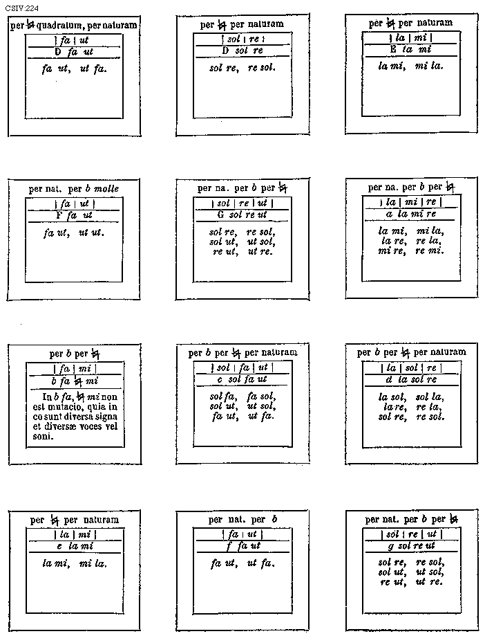 [224][CSIV:224; text: per [sqb] quadratum, per naturam, fa ut, D fa ut, fa ut, ut fa; per [sqb] per naturam, sol re, D sol re, sol re, re sol; per [sqb] per naturam. la mi. E la mi, la mi, mi la; per nat. per b molle, fa ut, F fa ut, fa ut, ut ut; per na. per b per [sqb], sol re ut, G sol re ut, sol re, re sol, sol ut, ut sol, re ut, ut re; per na. per b per [sqb], la mi re, a la mi re, la mi, mi la, la re, re la, mi re, re mi; per b per [sqb], fa mi, b fa [sqb] mi, In b fa, [sqb] mi non est mutacio, quia in eo sunt diversa signa et diversae voces vel soni; per b per [sqb] per naturam. sol fa ut, c sol fa ut, sol fa, fa sol, sol ut, ut sol, fa ut, ut fa; per b per [sqb] per naturam, la sol re, d la sol re, la sol, sol la, la re, re la, sol re, re sol; per [sqb] per naturam, la mi, e la mi, la mi, mi la; per nat. per b, fa ut, f fa ut, fa ut, ut fa; per nat. per b per [sqb], sol re ut, g sol re ut, sol re, re sol, sol ut, ut sol, re ut, ut re]